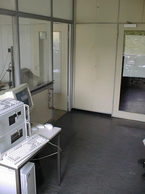 ![]() Kabel und Rack im Flur, Photographisch-künstlerisch wertvolle Aufnahme. Im Vordergrund ist deutlich das superdicke SCSI-Kabel mit aufwändiger Einzelabschirmung zu sehen. |